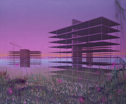 Minervini’s world is post-apocalyptic: shells of finely rendered, multi-story buildings hold court over an otherwise structure-less landscape that is filled only with shrubs, grasses and marshland. Trees are noticeably and suspiciously absent. Luminous multihued skies — oranges and pinks, blues and yellows — place the scenes at the beginning or end of the day, a visual metaphor for the larger “end of days” message. But these works are more hopeful than full of doom; they are very sparsely populated with humanity, small flowers are in bloom. The tone is of rebuilding and regeneration. These structures are new, as indicated by the presence of a crane in one work, placed far in the distance, and the fact that they are whole and show no signs of wear.