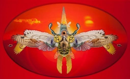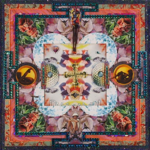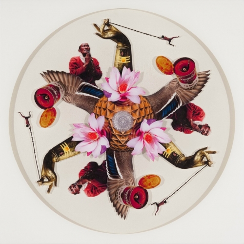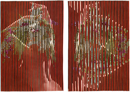The results are mesmerizing. The evenness of the repetition of the strips sets up a meditative rhythm. And movement is created by the vacillations of the strips, as well as the shape of the strips themselves (the works with the arched strips call to mind a record, which speaks to the artist’s avid interest in music). Then there is the intense visual engagement, as the eyes are compelled to continuously shift emphasis so as to pull out one image. A longer look reveals greater details in an individual image — flowers, female figures — and then, as the eye begins to bring into focus another of the images, the first image appears to fade, becoming almost ghostly. At times, the images all work together to form yet something else again. Mackenzie does an amazing job of playing forms from different images off of each other. While the concept at its heart, given the visual complexity, is relatively straightforward — it’s an interweaving of images — the resulting optical playground evocatively teases with ideas of how much to keep hidden and how much to reveal.